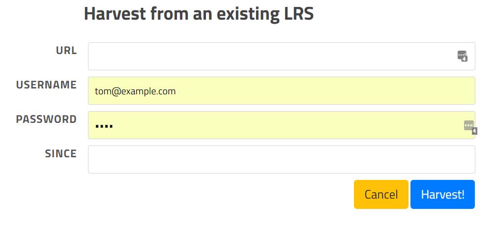 Veracity Learning LRS provides a simple tool to help you import all the xAPI statements from another LRS. Choose "Harvest Statements" from the "Import / Export" page. You'll see a form like this one.