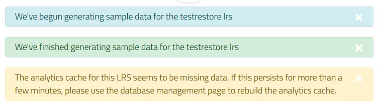 If for any reason you need to temporality take the LRS offline, so it can no longer receive statements, you can click "Deactivate LRS". This can take a few seconds to become active. Once it does, all clients connecting to the xAPI endpoint will receive an error message indicating that the LRS is offline. xAPI read and write operations will not modify the state of the database.