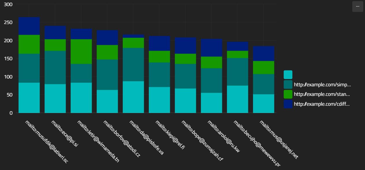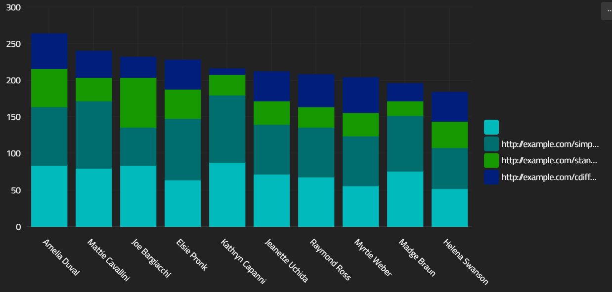 The above query will generate 3 bar charts in $parallel! See $each for an explanation. Our renderer does not support a query result that is an array of charts - we need to combine them, or call the renderer once for each result. $mergeCharts can merge multiple line charts, multiple bar charts or multiple pie charts into a "multiseries" bar, pie or serial chart. A multiseries pie or bar differs in that bars are not split, but grouped. Note also that the series title will be displayed if there are multiple series.